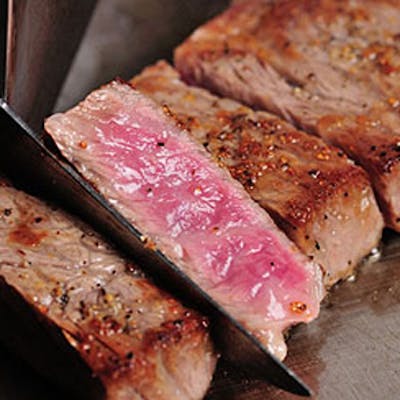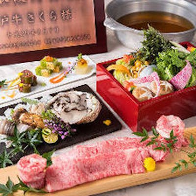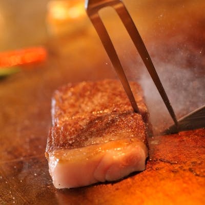 魚介鉄板焼の盛り合わせ、国産黒毛和牛サーロインステーキ、黒豚玉or黒豚焼そば(ハーフ)などが一度に味わえるコースに1ドリンクがついたプラン。