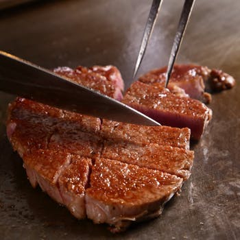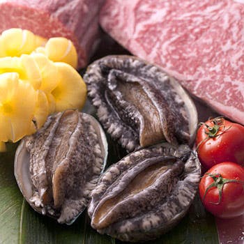 魚介鉄板焼の盛り合わせ、国産黒毛和牛サーロインステーキ、黒豚玉or黒豚焼そば(ハーフ)などが一度に味わえるコースに1ドリンクがついたプラン。