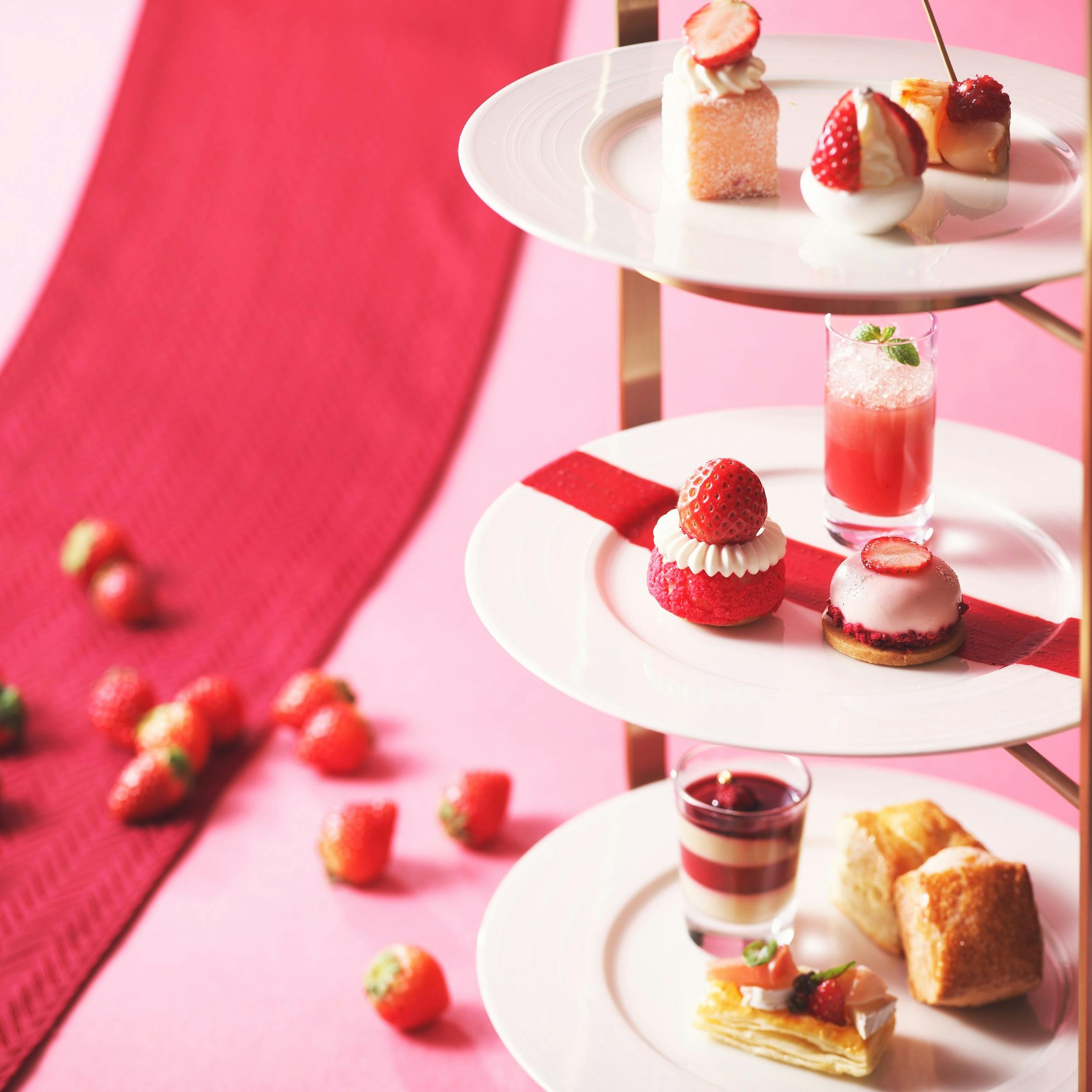 今季は、豪華で華やかなレッドカーペットから着想を得て、“フルーツの女王”ともいわれる苺をエレガントでフォトジェニックなスイーツ&セイボリーに仕上げています。